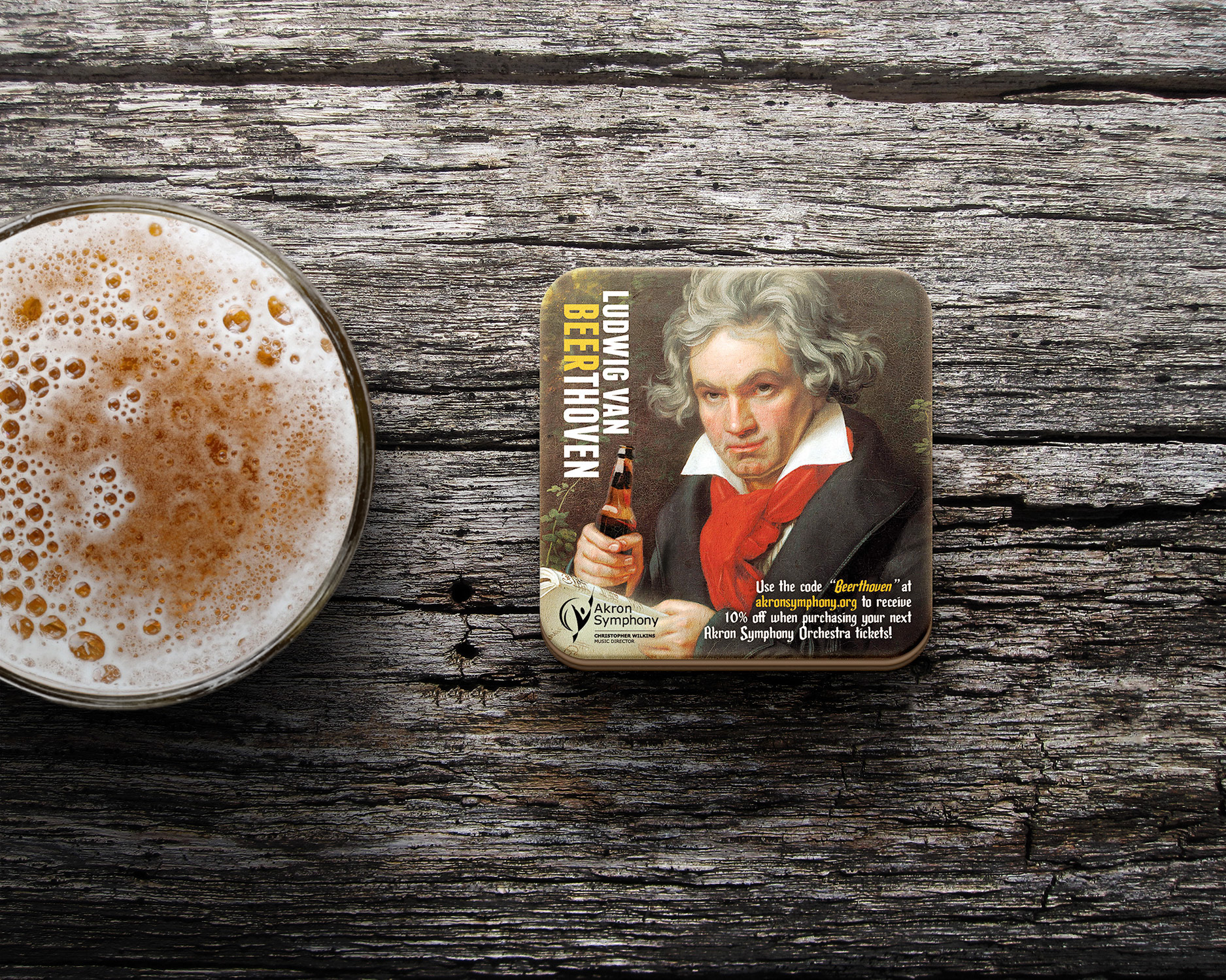 The Akron Symphony Orchestra created the idea for "Beerthoven" to promote their orchestra concerts at local breweries and pubs. Anyone can enter the code "Beerthoven" at checkout to receive 10% off the ticket price. The project consisted of using the standard image of Beethoven in a beer coaster design which would be distributed around the area at various establishments.