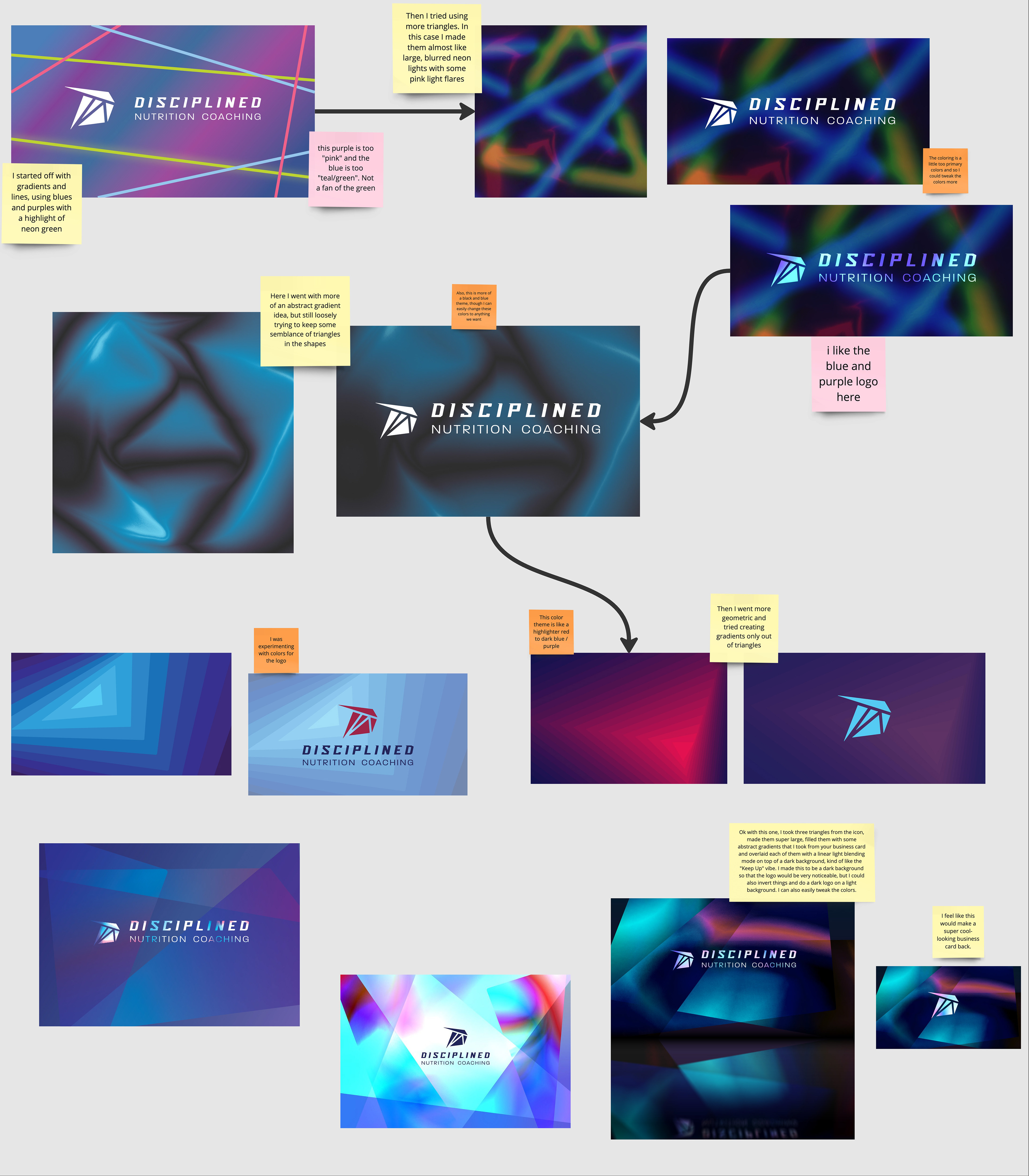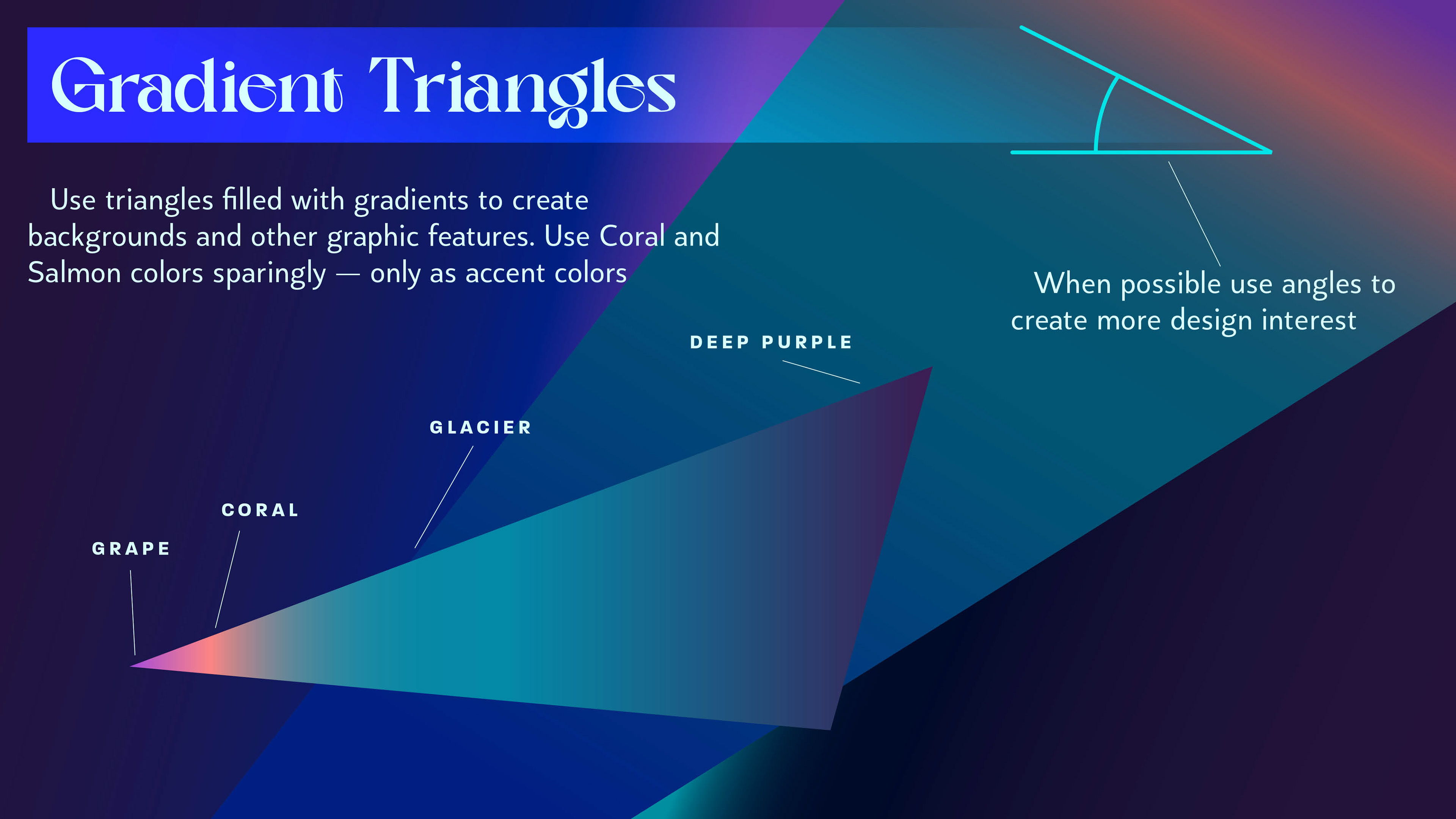 To create the more "serious" side of the identity, triangles were chosen, but to represent the "softer," "harmony and balance" side of the identity, gradients were chosen. Combining these two, triangles filled with gradients, creates the overall style and aesthetic of the brand.