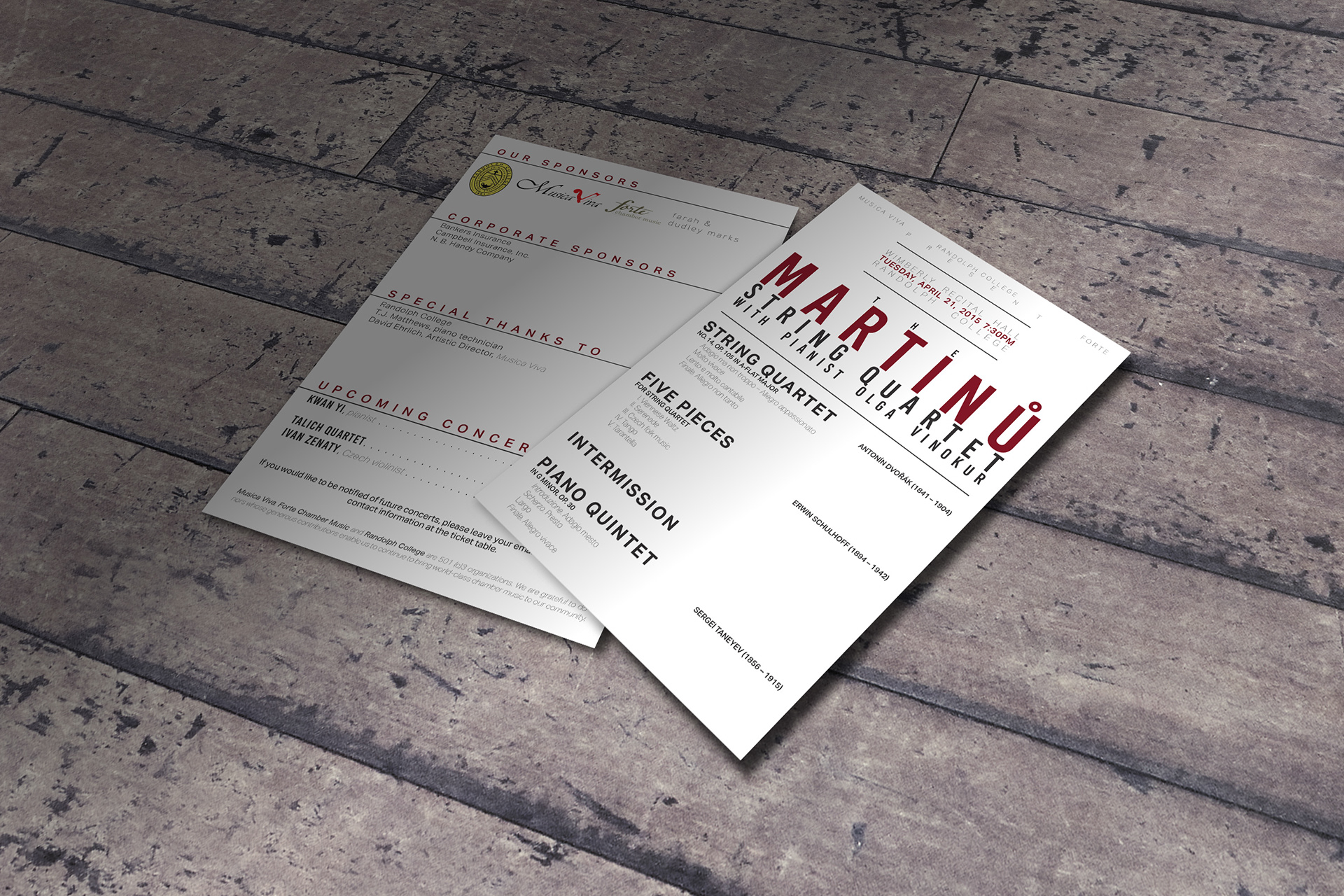 Print Design Pack for Forte Chamber Music featuring the Rolston String Quartet. Package included a poster, mailer, and program all with a unified theme.
