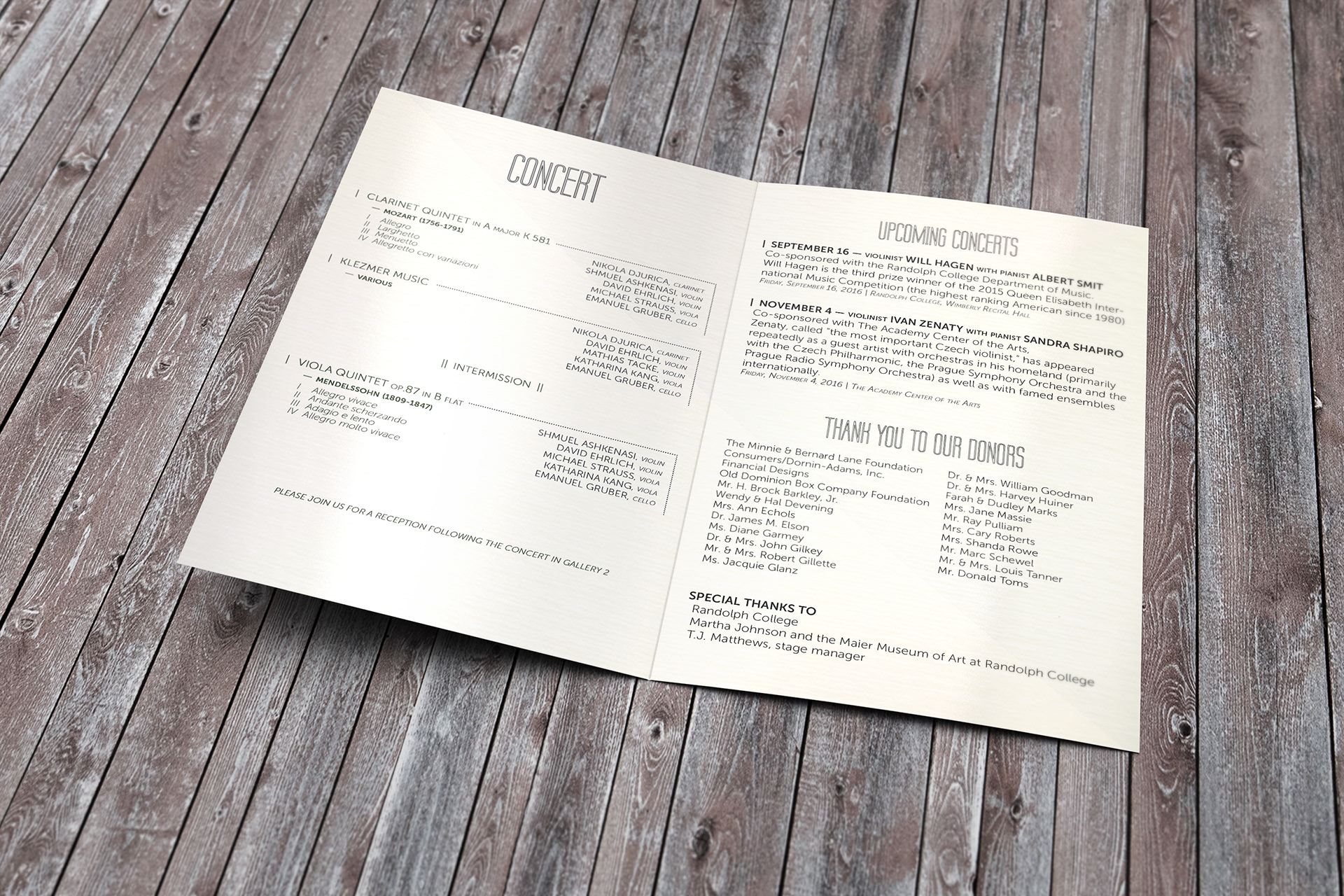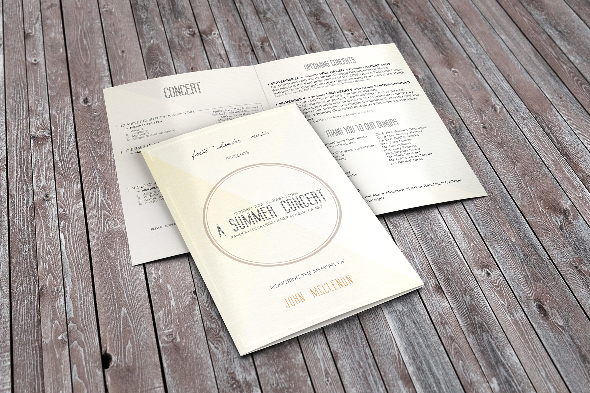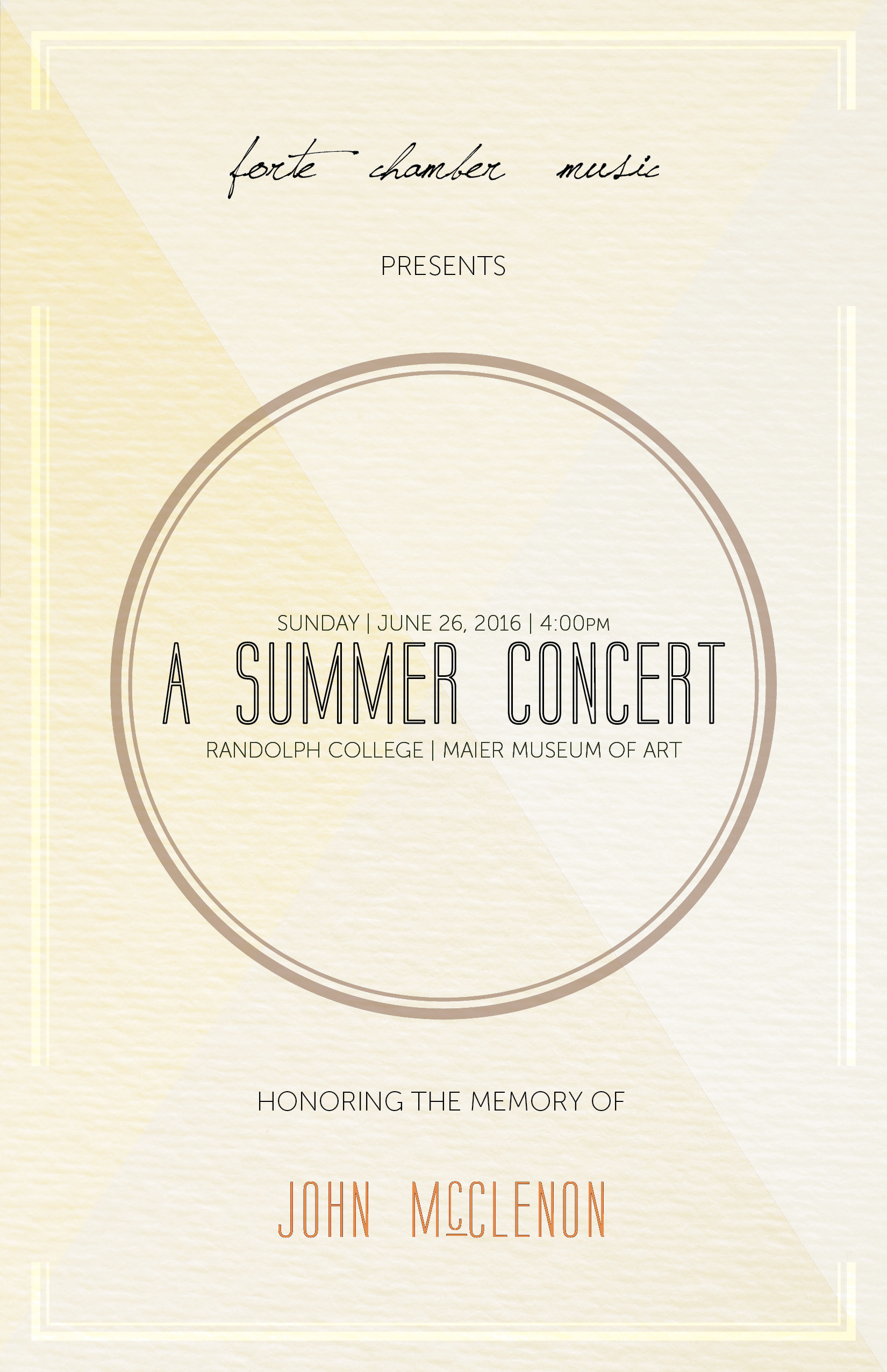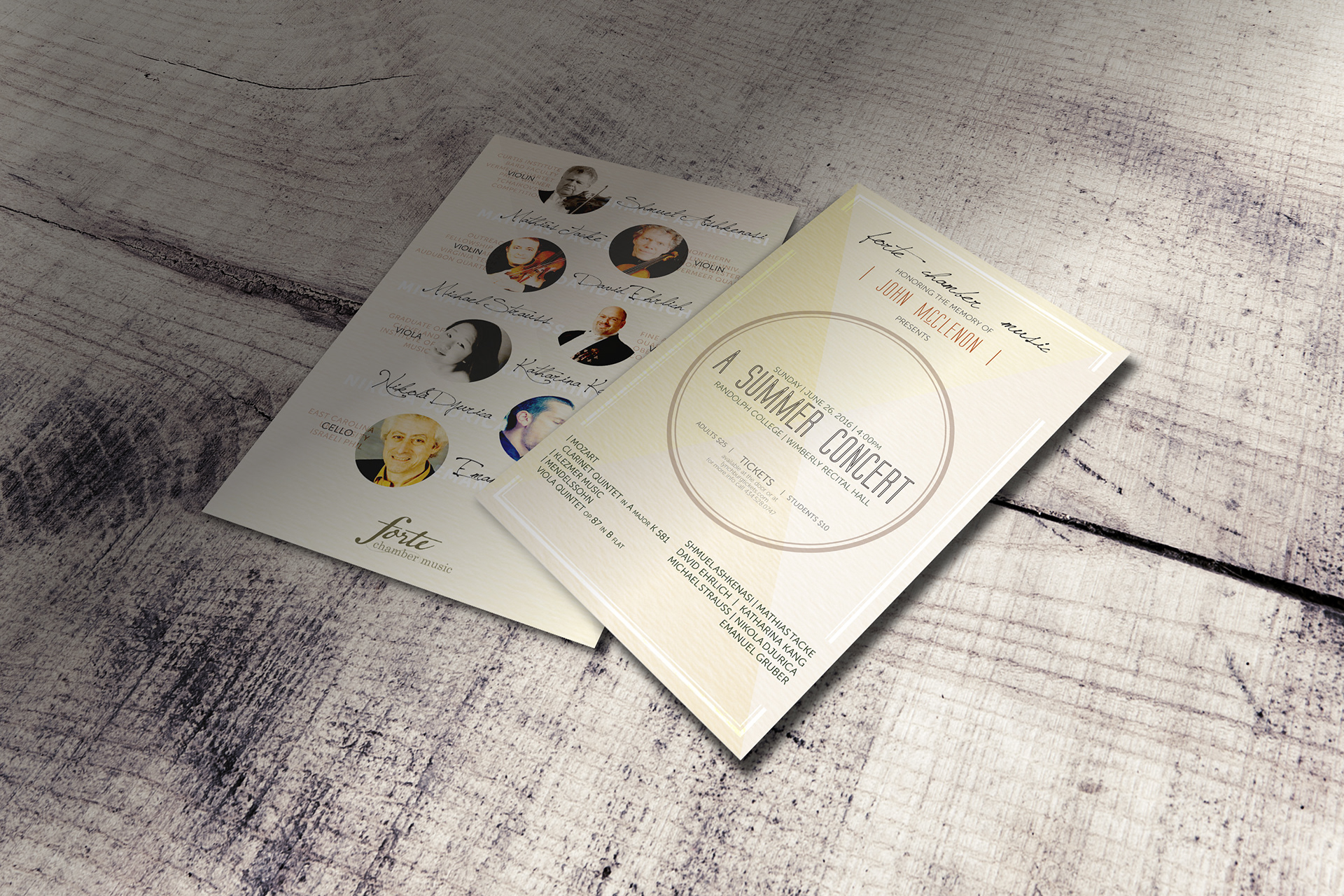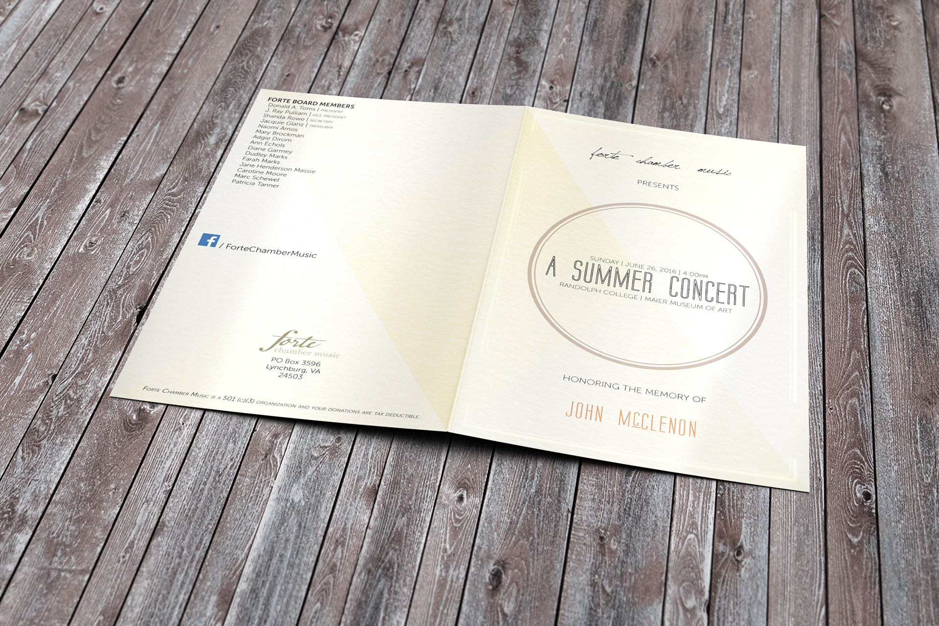 Print Design Package for Forte Chamber Music featuring the Mozart, Mendelssohn, and Klezmer music included a half-sheet flyer, mailer, and program all designed in a light, modern summer feel.